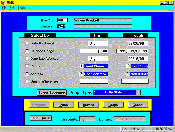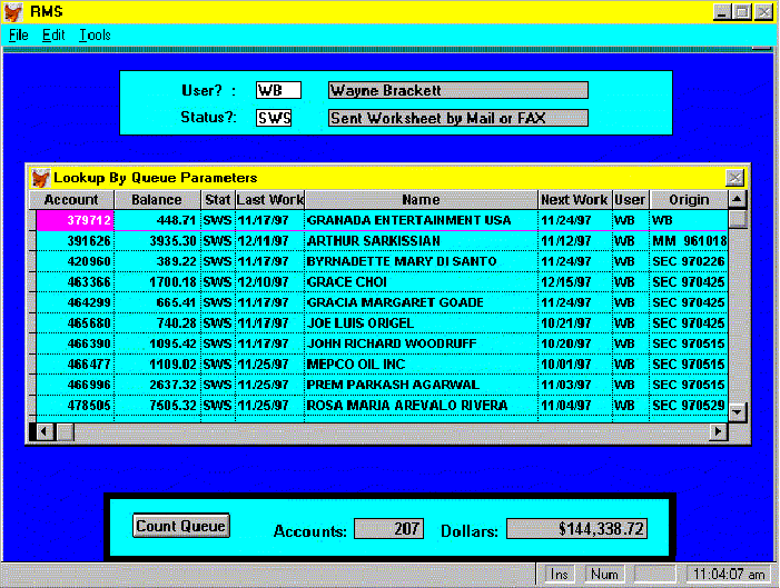 The second screen shows a listing of the accounts meeting the suplied criteria. This list can then be processed in any desired order.